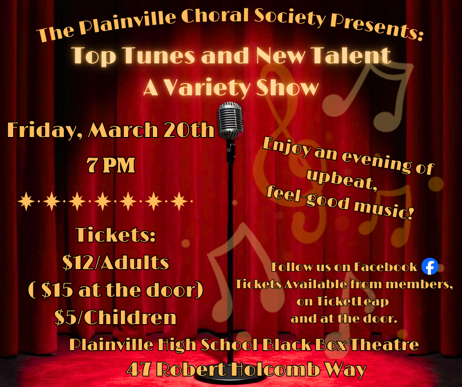This weekend the Congregational Church of Plainville is putting on this wonderful event. The Plainville Choral Society will be participating on Sunday’s, “Plainville’s Got Talent Concert” We would love to see your smiling faces!
